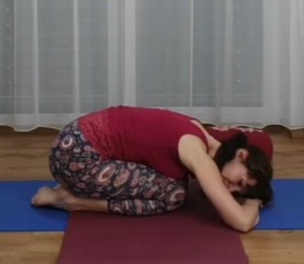 - ve stoji s pokrčenými koleny se opřít lokty o kolena, vyvěsit hlavu, jemně zakulatit záda a dýchat do zad