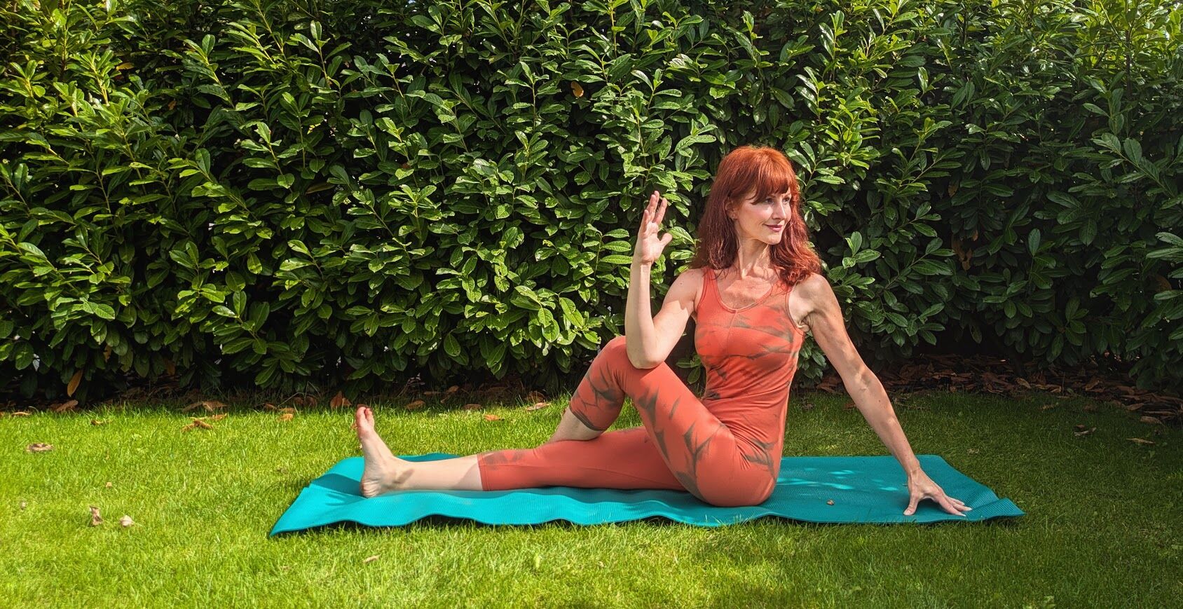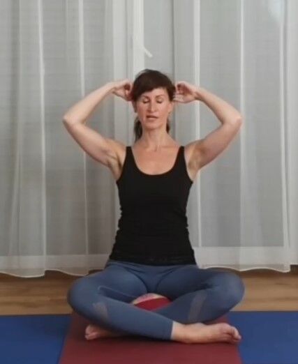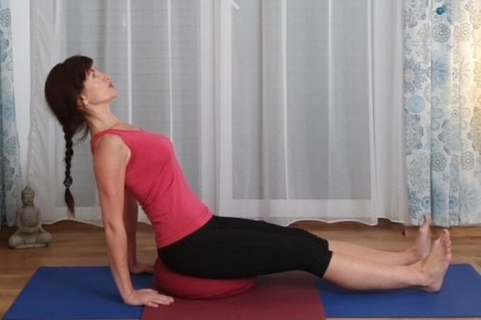 - jemný záklon v sedu s nataženýma nohama, hlava v prodloužení (vhodné je vypodložit se pod sedacími kostmi blokem)